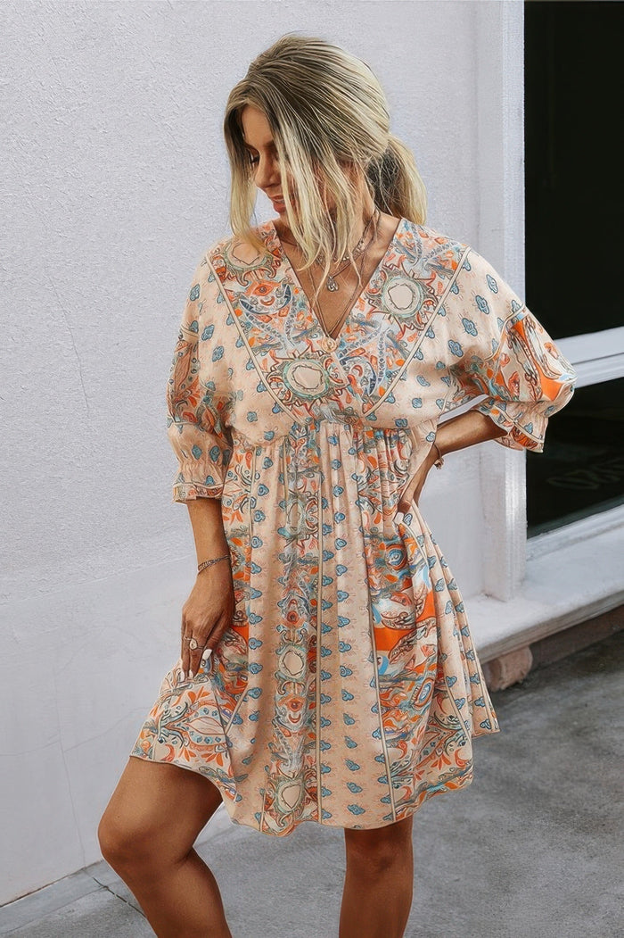 - Features: V-Neck, 1/2 Sleeve, Graphic Print, Low Back, Loose Fit, Swing, Ruffled, Short Dress, Casual