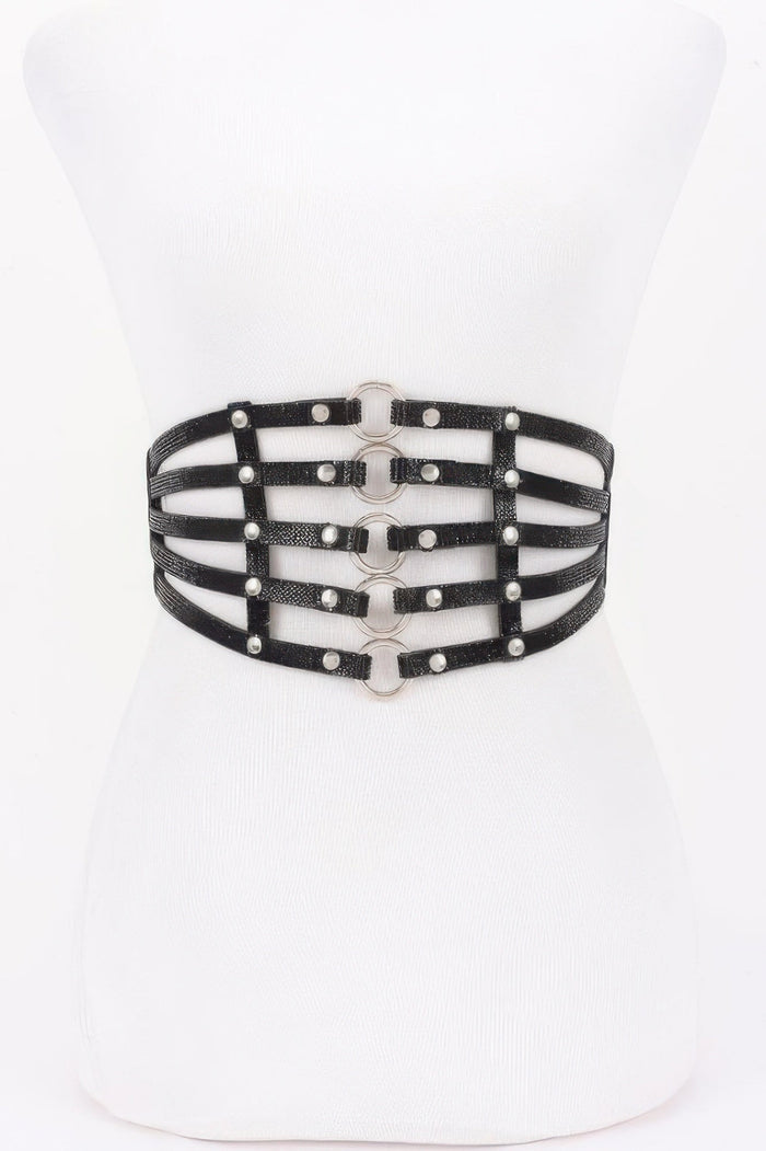 Make a dazzling statement with the Wide Rhinestone Waist Belt, designed to turn heads with its bold sparkle and structured silhouette. Featuring a lattice-style multi-strap design, this belt is richly studded with rhinestones for maximum shine. Metal ring accents connect the straps, creating a captivating geometric look. With its stretch construction and waist-cinching shape, it’s the ultimate accessory for adding drama to any outfit.