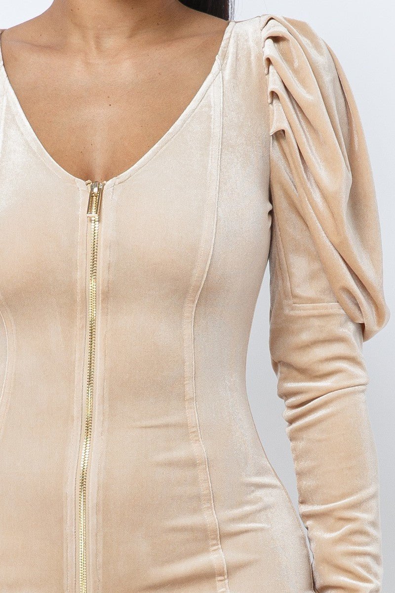 Elevate your evening attire with our Soft Velvet Pleated Puff Sleeve Low V-Neck Front and Back Mini Dress, featuring a touch of luxury with gold accent zippers and a stylish back tie around the neck. Crafted with meticulous attention to detail, this dress seamlessly combines opulence with contemporary style, creating a stunning and glamorous look for special occasions.